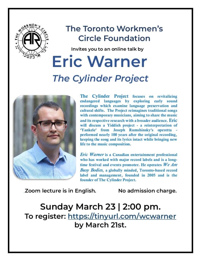 / Events / By Arbeiter Ring Toronto Workmen’s Circle Foundation hosts Eric WarnerThe Cylinder ProjectSunday March 23, 2025 | 2:00 pmZoom Webinar in English. No admission charge. Registration required by March 21st athttps://tinyurl.com/wcwarner/See flyer below for full description.